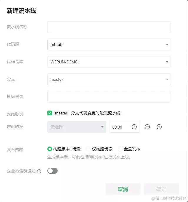 在发布策略中,因为生产环境要求稳定,所以不能直接全量发布,可以选择仅构建镜像,或者构建版本。