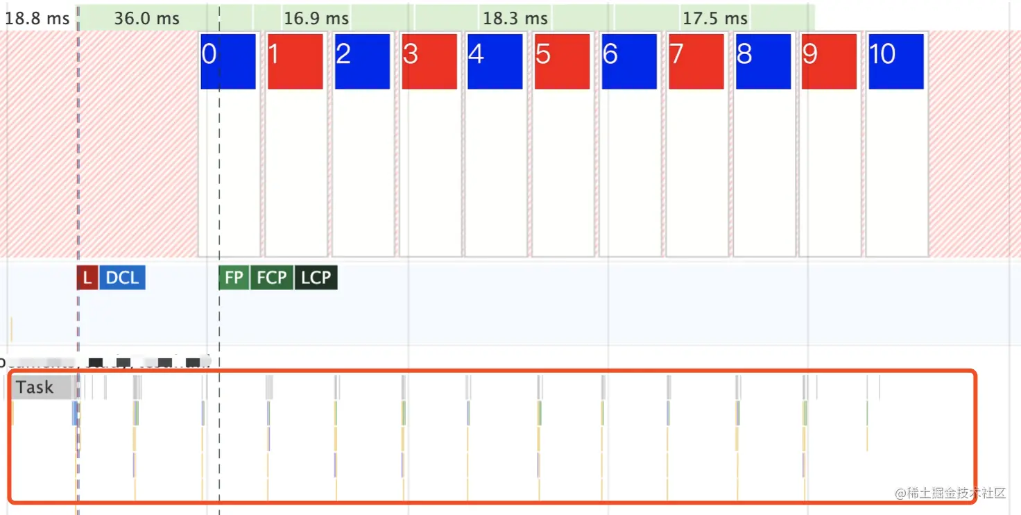 通过 Chrome 的 Performance 记录,运行过程,首先看下 Frame 只有一个,直接渲染出了最后的结果,如果按照上例,我们可能会觉得应该是在每个微任务执行时都会有一次渲染 blue -> red -> blue -> ...