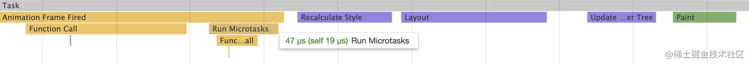 放大其中一个看看任务的执行情况,requestAnimationFrame 也可以看作一个任务,可以看到它在运行之后执行微任务。