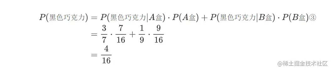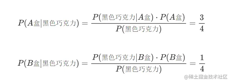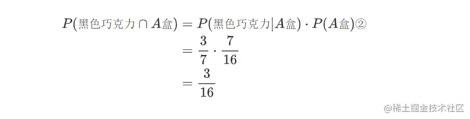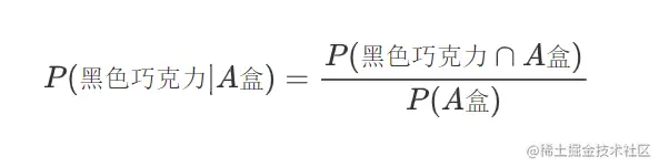 这说明已知一块黑色巧克力是来自A盒的,它的概率等于巧克力是黑色的并且来自A盒的概率除以巧克力来自于A盒的概率