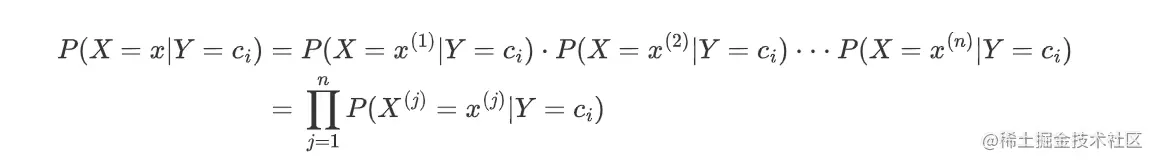 根据朴素贝叶斯所有的x(1),x(2),....,x(n)都是相互独立的,那么分子其中一部分的就可以写成: