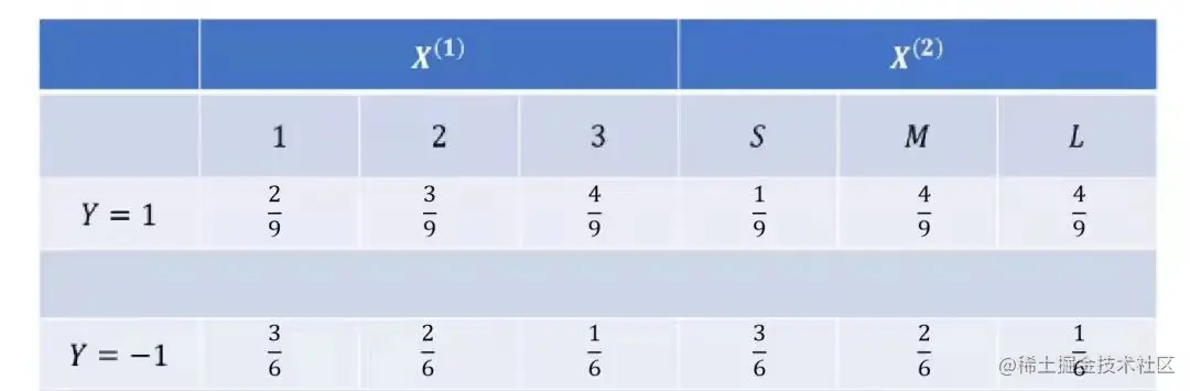数据集的X有两个特征,分别是 X(1) 和 X(2),其中 X(1) 的取值空间为{1,2,3},X(2) 的取值空间为{S,M,L},这里需要对每一类中的每一个特征分别进行计算: