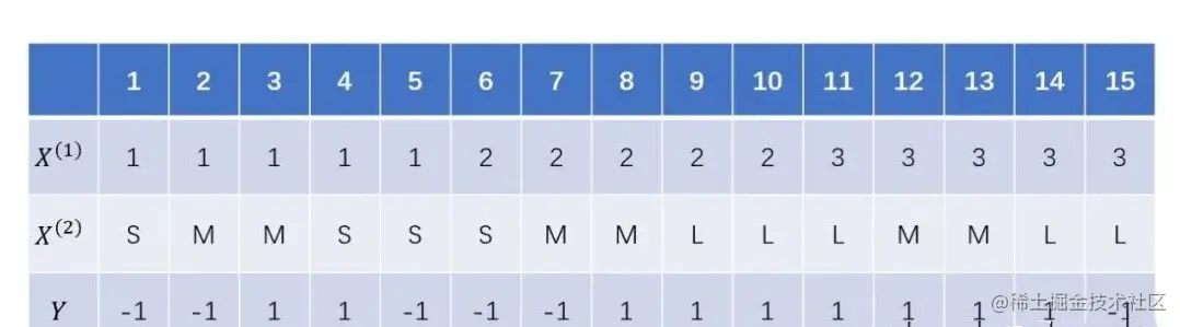 数一数🔍就知道,在这个数据集中,有2个类别,分别是Y=1和Y=-1两类,总共有实例15个,