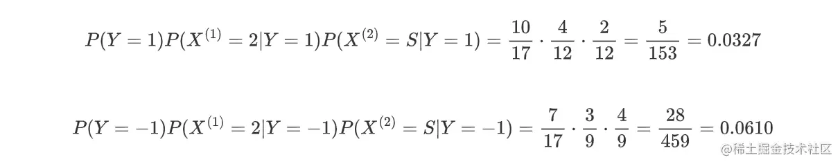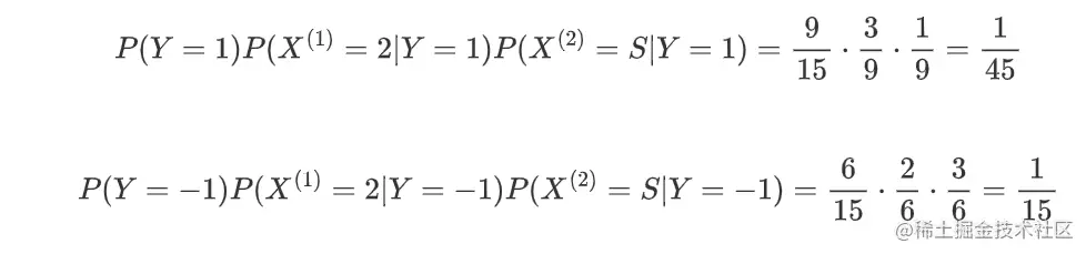假如两个特征相互独立,对于实例 x=(2,S) 而言,分别计算两个类别下的后验概率