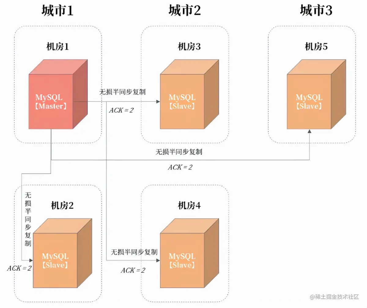 由于有五个机房,所以 ACK 设置为 2,保证至少一份数据在两个机房有数据。这样当发生城市级故障,则城市 2 或城市 3 中,至少有一份完整的数据。