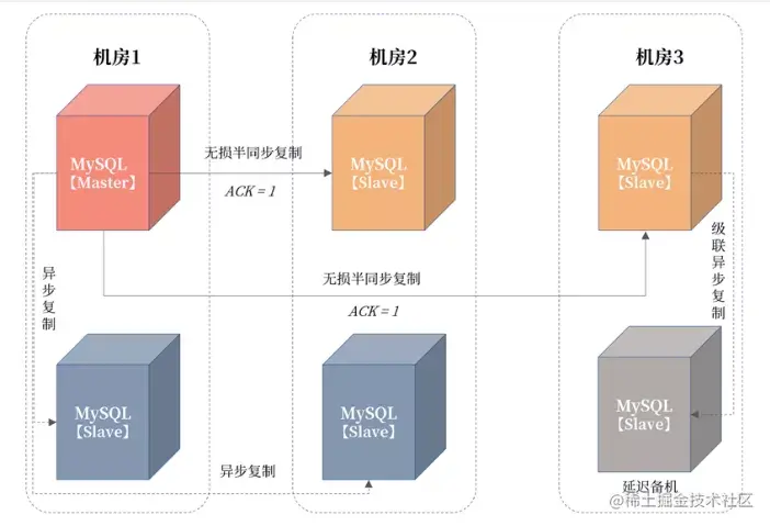 在三园区架构中,一份数据被存放在了 3 个机房,机房之间根据半同步复制。这里将 MySQL 的半同步复制参数