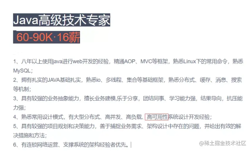 又赶上一年一度的金九银十的日子,这段期间的招聘岗位相对前几个月会多些,如果在目前公司没有进步、没有前途时,这段时间可以准备一下,去外面看看机会。不过在外面找工作时,可以提前在网上看看招聘信息,看看自己是否达到公司要求。如果多看下高薪资的技术人员招聘要求时,就会发现对三高都有一定的要求,比如下面一家公司的要求就对高并发、高负载和高可用性系统设计要有开发经验。