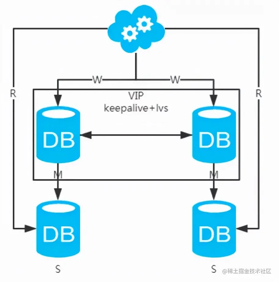 2、高性能分析: 读写都操作主库,很容易产生瓶颈。大部分互联网应用读多写少,读会先成为瓶颈,进而影响写性能。另外,备库只是单纯的备份,资源利用率50%,这点方案二可解决。
