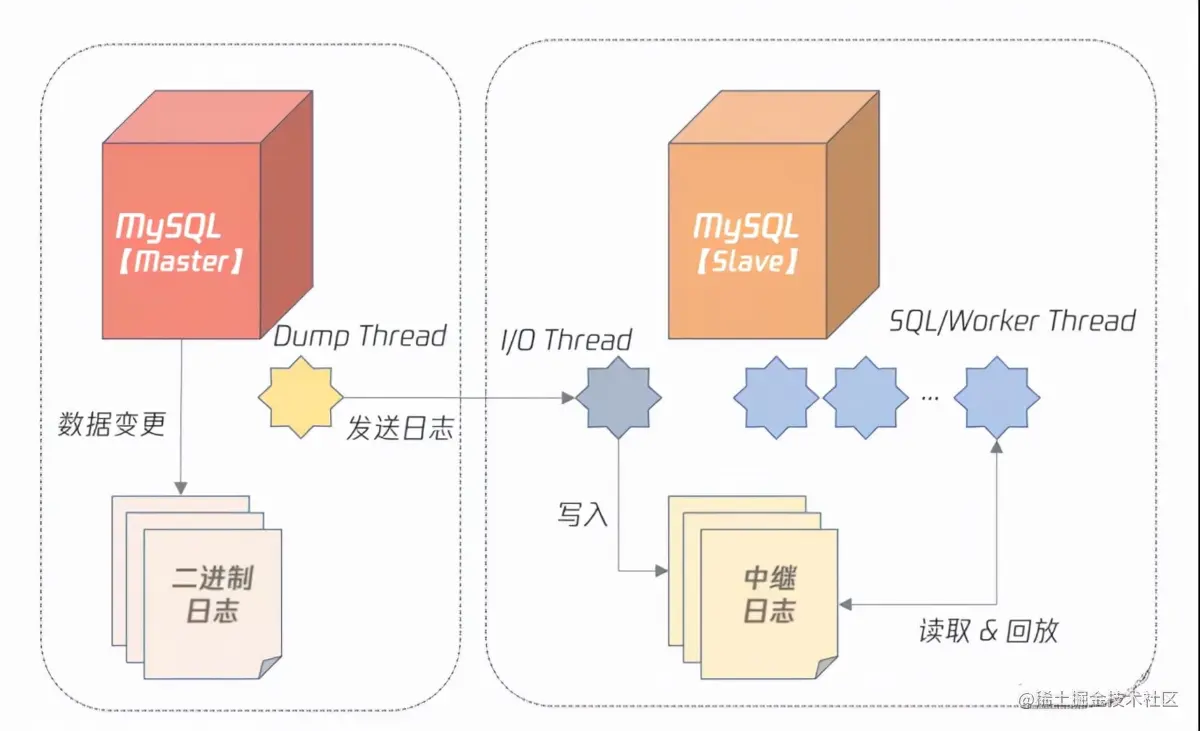c. SQL/Worker 线程负责并行执行中继日志,即在 Slave 服务器上回放 Master 产生的日志。