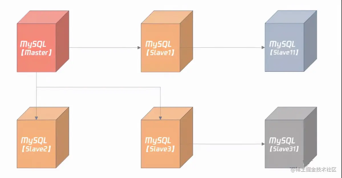 可以看到,在 MySQL 复制中,一台是数据库的角色是 Master(也叫 Primary),剩下的服务器角色是 Slave(也叫 Standby):