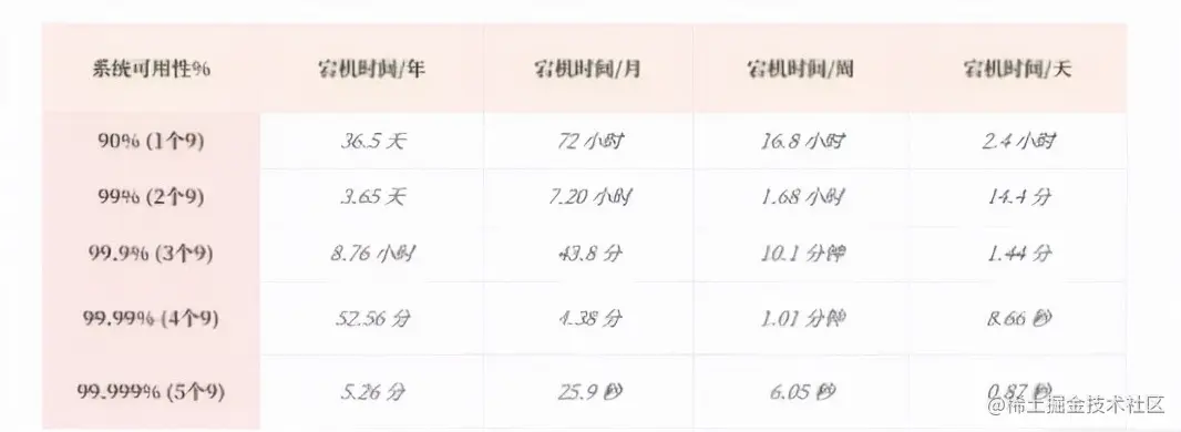 通常来说,系统至少要达到 4 个 9(99.99%),也就是每年宕机时间不超过 52.56 分钟,否则用户体验会非常差,感觉系统不稳定。