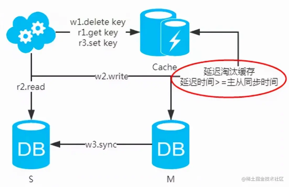 注:如果按照这种方式,图一,不会产生DB和缓存不一致问题;图二,会产生DB和缓存不一致问题,即r2.read先于w3.sync执行。如果不做处理,缓存里的数据可能一直是脏数据。解决方式如下: