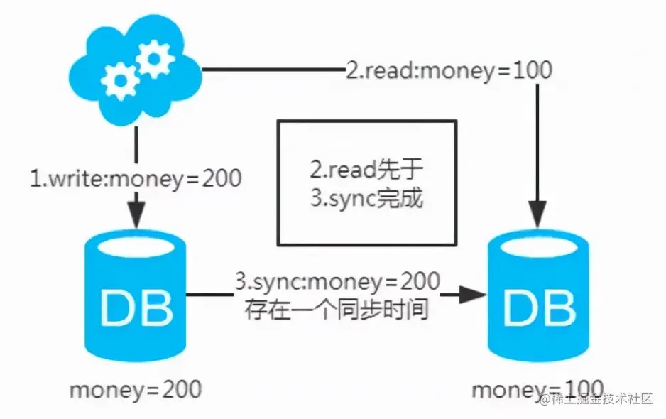 注:图中圈出的是数据同步的地方,数据同步(从库从主库拉取binlog日志,再执行一遍)是需要时间的,这个同步时间内主库和从库的数据会存在不一致的情况。如果同步过程中有读请求,那么读到的就是从库中的老数据。如下图。