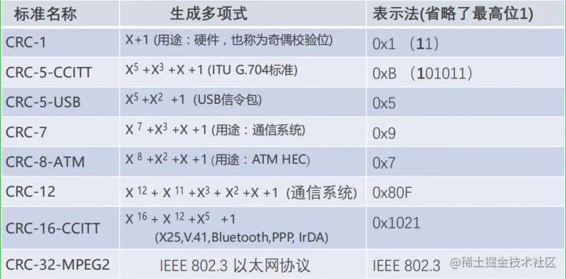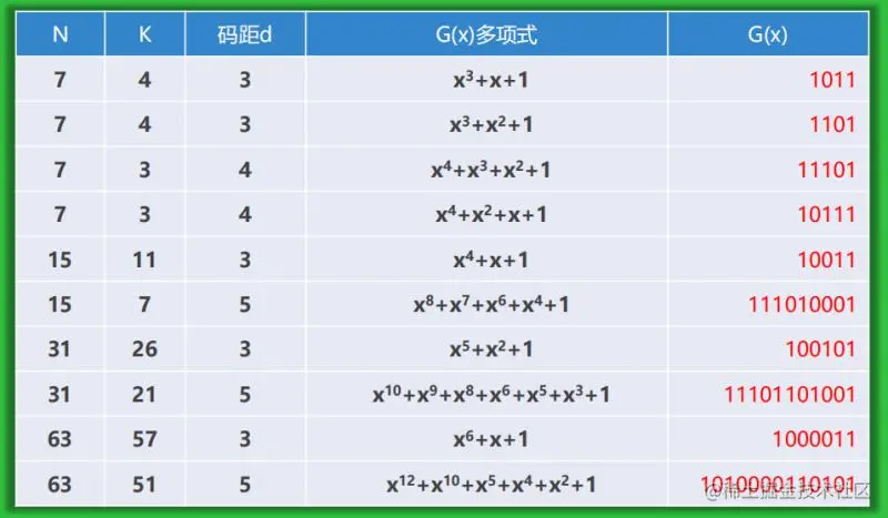 - 生成多项式G(x) 收发双方约定的一个(r + 1)位二进制数,发送方利用G(X)对信息多项式做模2除运算,生成校验码。接收方利用G(X)对收到的编码多项式做模2除运算检测差错及错误定位