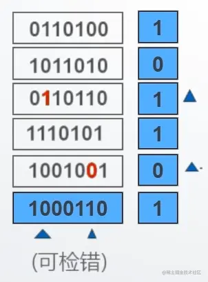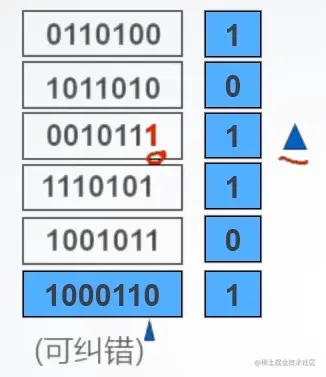 - 根据有效信息计算校验信息位,使校验码(数据+1位校验信息)中1的个数满足奇/偶检验的要求