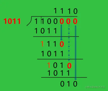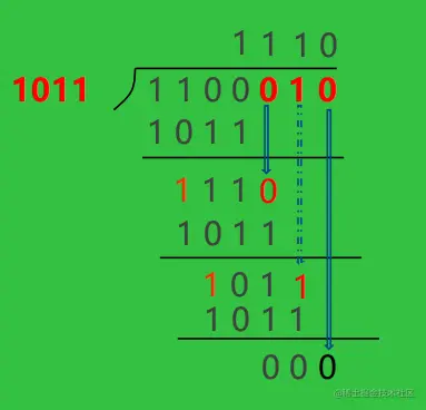 - 用得到的余数替换Q(X)’的最后r位即可得到对应的CRC编码 1100 010