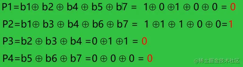 设被传送的信息b1b2b3b5b5b6b7 = 1 0 1 1 0 0 0,采用偶校验 则