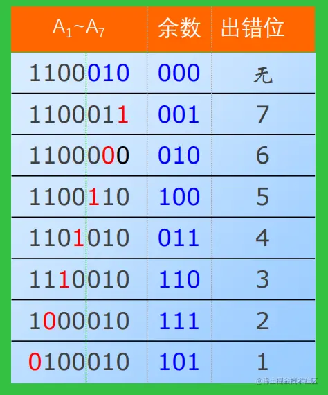 - 若余数不为0,一边对余数补0继续做模2除,同时让被检测的校验码循环左移,当余数为101时,出错位也移到A1位置。通过异运算纠正后继续循环左移和执行余数模2除法,直到修改后的出错位回原位。不需对每一位提供纠正电路 - 当位数增多时,循环码校验能有效地降低硬件代价,这是它得以广泛应用的主要原因 -