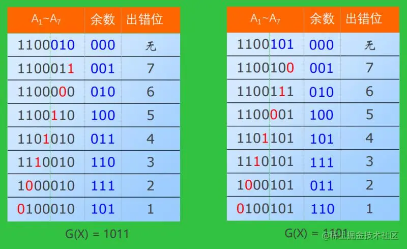 - 接收方利用G(X)对收到的有错编码多项式做模2除运算