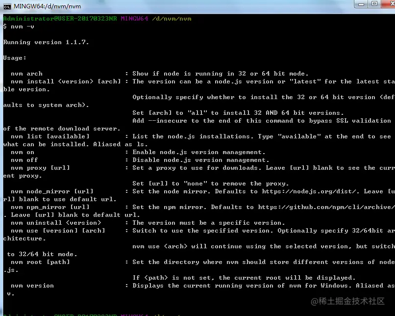 nvm version:用于展示当前在windows系统运行的nvm版本