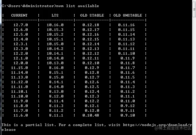 nvm list [available]:用于展示node的版本,加一个 available 可以查看所有可安装的版本