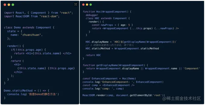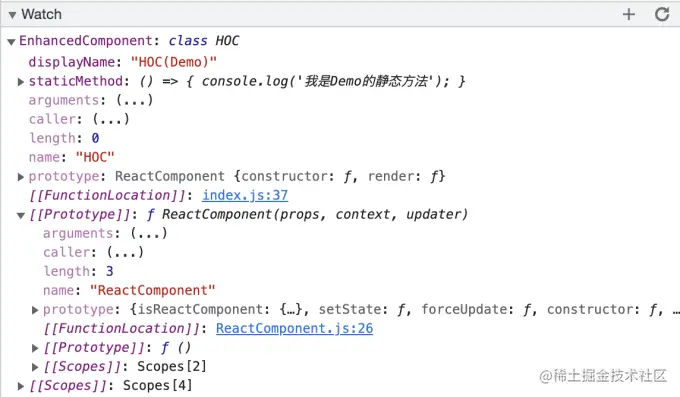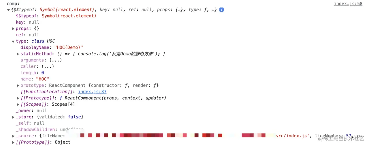 const EnhancedComponent = Hoc(Demo)可以通过浏览器看到EnhancedComponent变成了class HOC类,并且继承了React component - 当代码执行遇到jsx语法