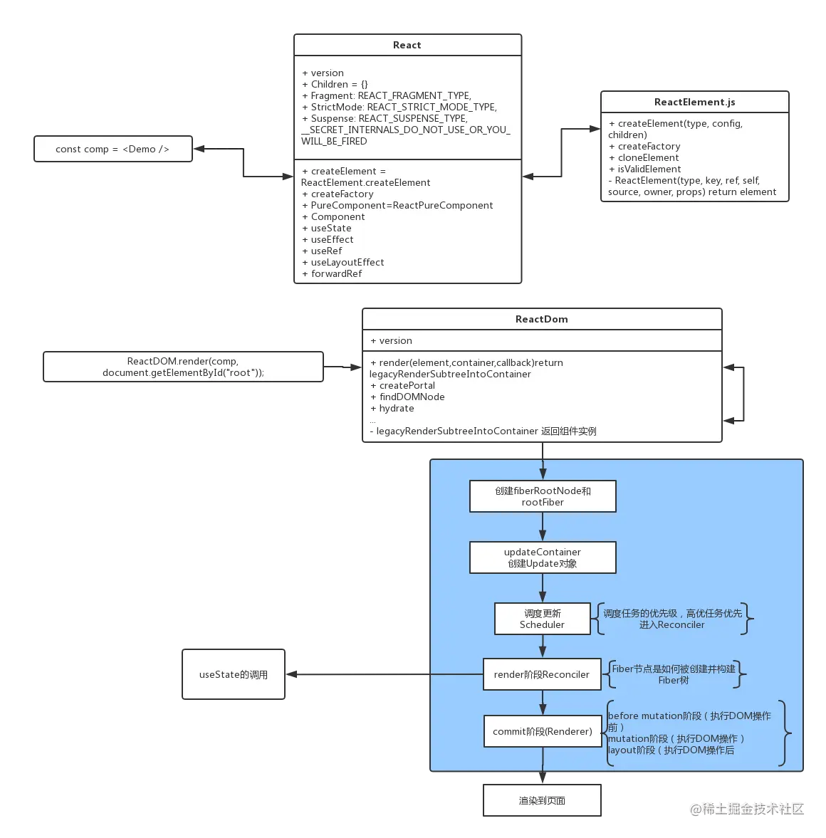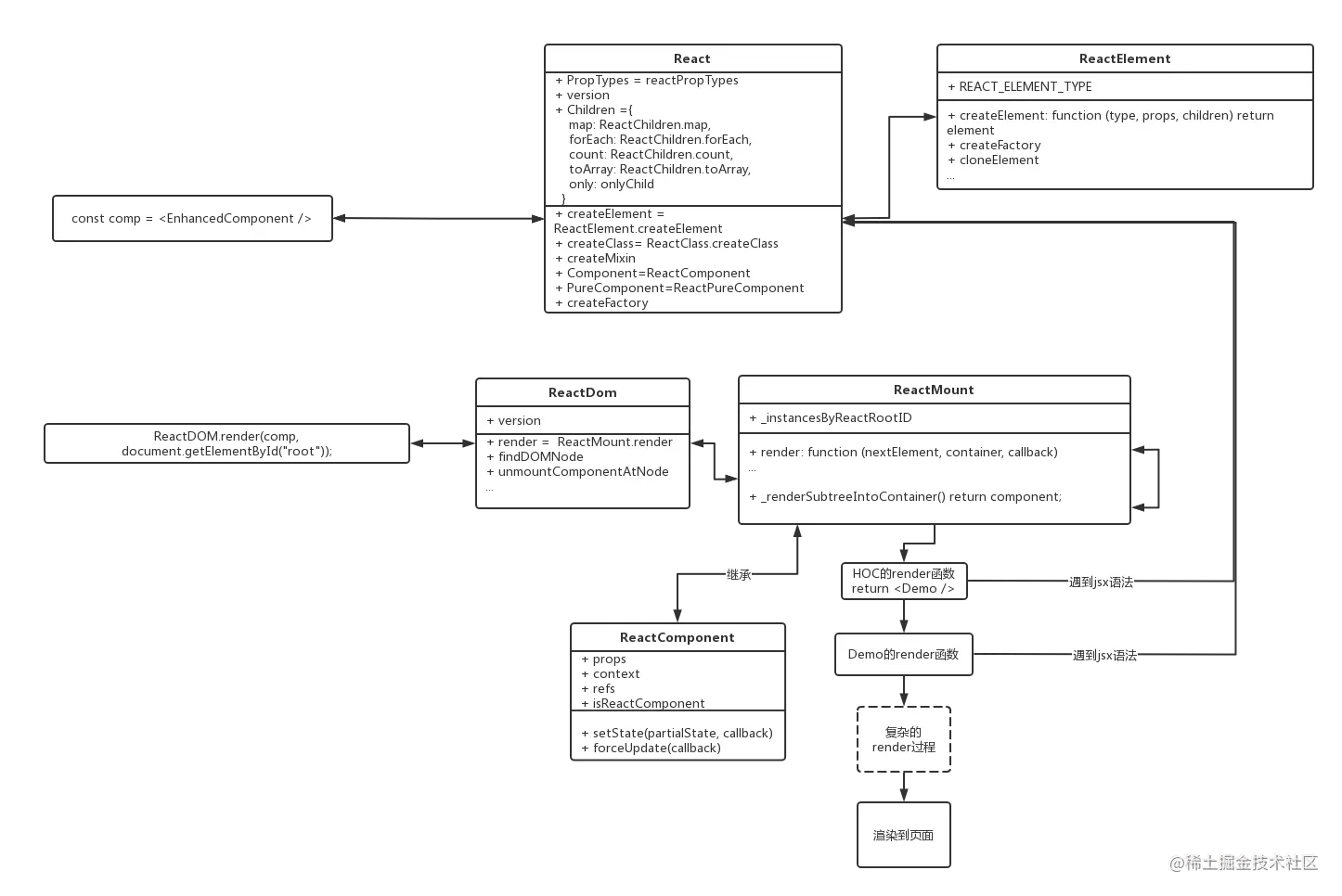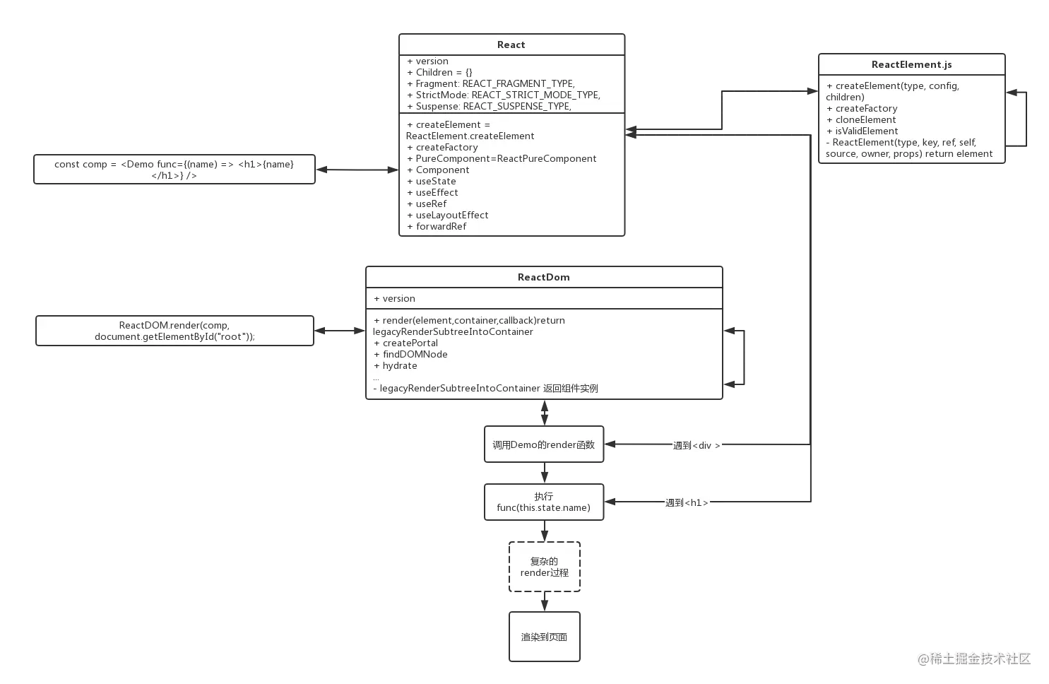 基于2.2 demo,画了如下基础的React相关的类图及调用关系。