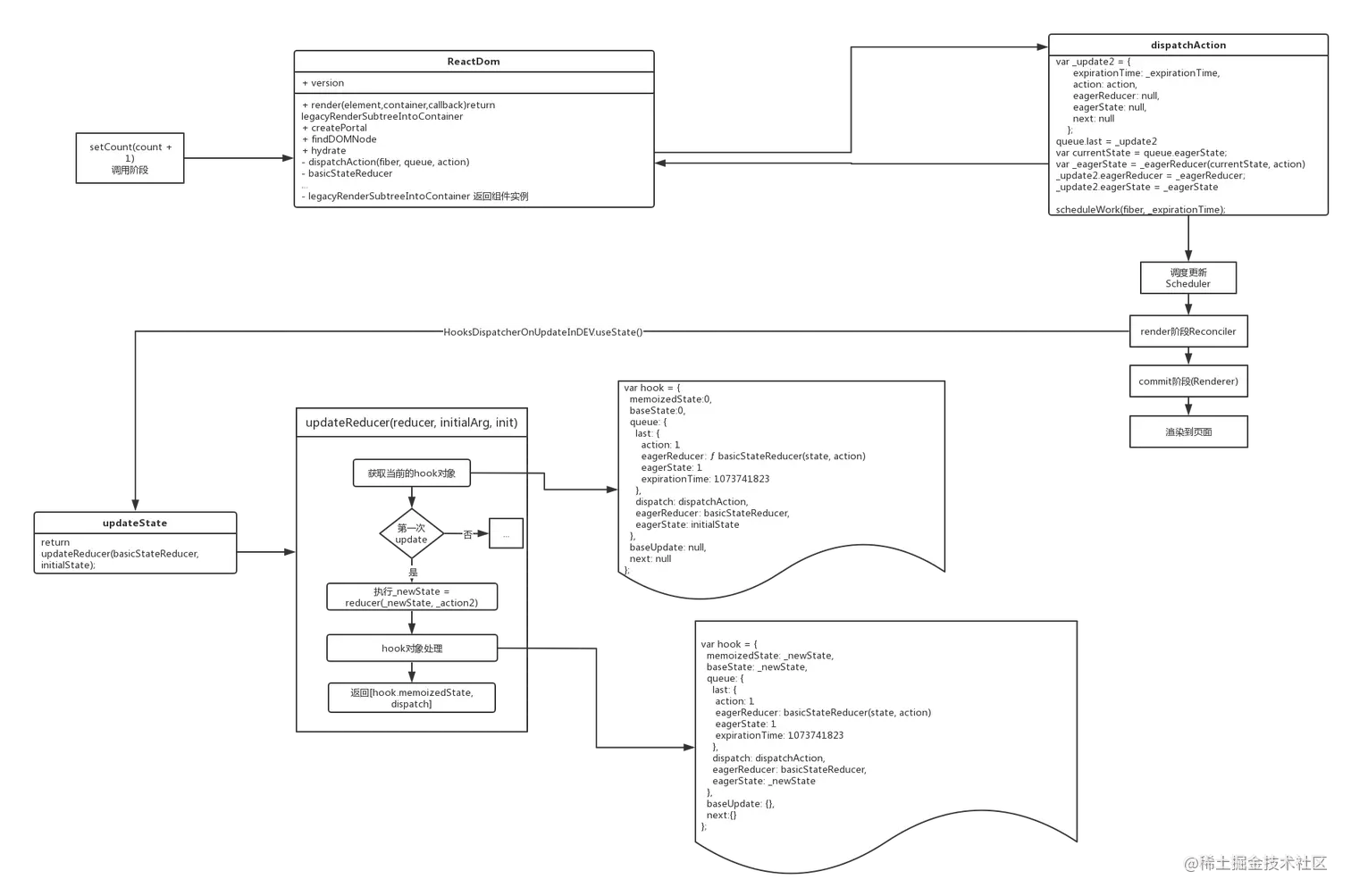 当我们点击主动触发setCount(count + 1)时,可以看下面流程图理解: