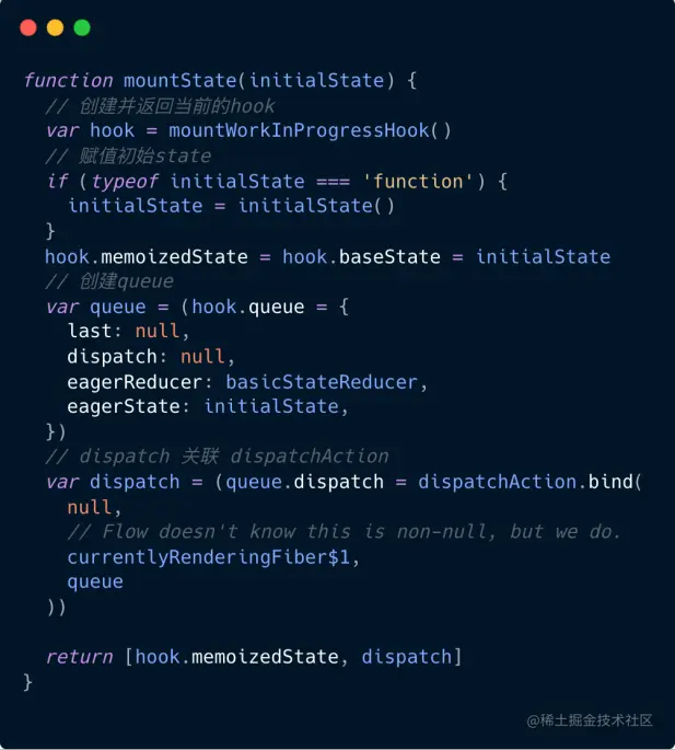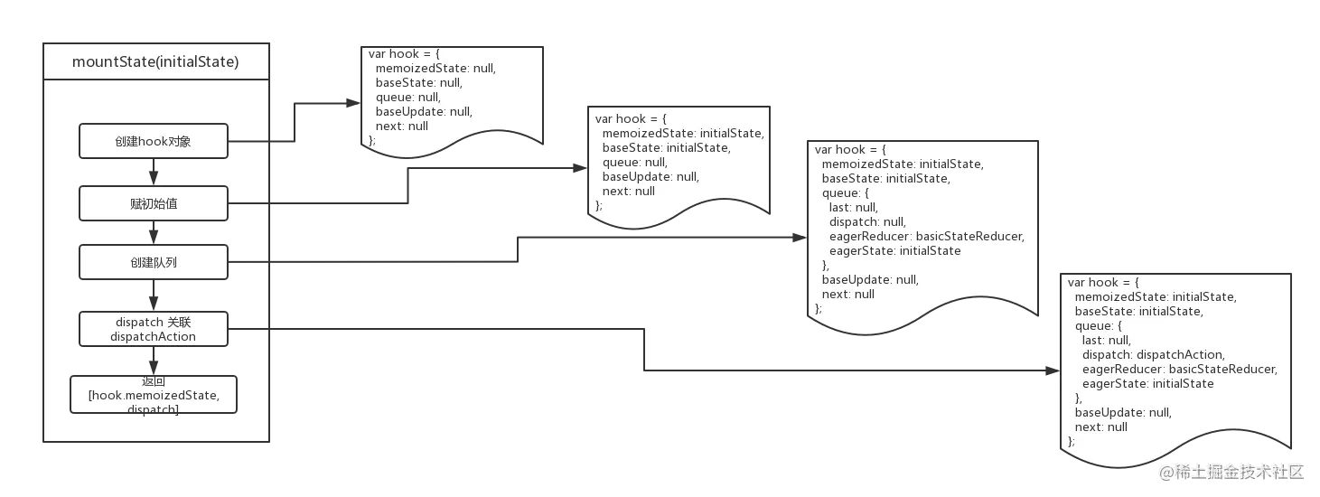 创建hook对象,用于存放初始值和dispatch函数,便于调用阶段的数据更新,当执行 useState(0),实际上是执行 mountState(0),initialState即0赋值给memoizedState,dispatch关联内部dispatchAction函数, 最终返回[hook.memoizedState, dispatch],也是正好对应了[count, setCount]的解构赋值,最终count被赋上了初始值,setCount也关联上了内部定义的dispatchAction。