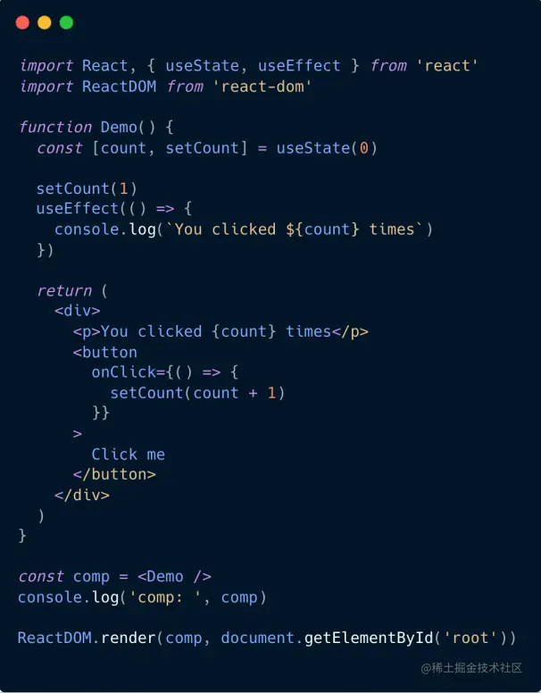 其实这一次调用是在执行Demo组件中的这行代码: const [count, setCount] = useState(0); 一路追踪useState,最终定位源码:
