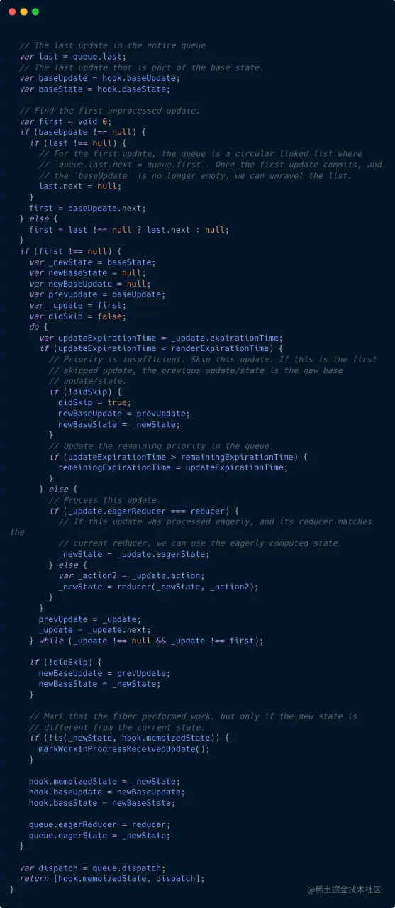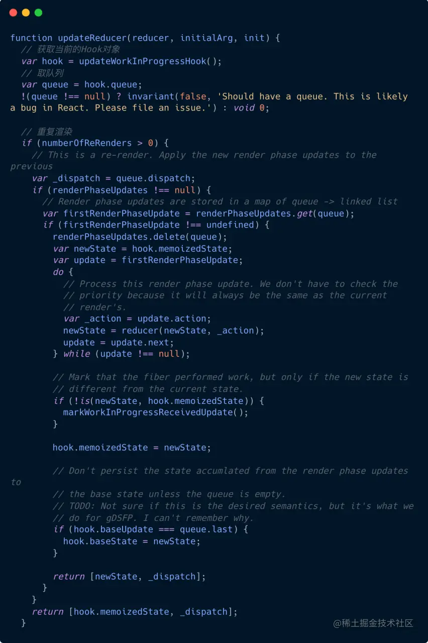 最终执行的updateReducer,获取了声明阶段定义的hook对象,判断非首次更新则进入优化策略,是首次更新则会计算结果_newState的值,然后更新hook对象的新计算值memoizedState,初始值baseState、队列中记录的上一次更新的dispatch函数以及计算值,并最终返回[hook.memoizedState, dispatch],此时count值就变更成了1。
