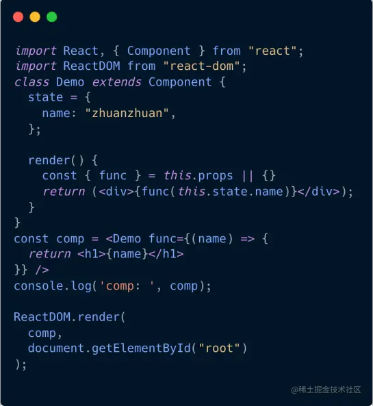 const comp = <Demo func={(name) => { return <h1>{name}</h1> }} />, 会调用React.js的createElement方法,其实调用的是ReactElement.js中createElement方法转成react element节点。 - 当代码执行