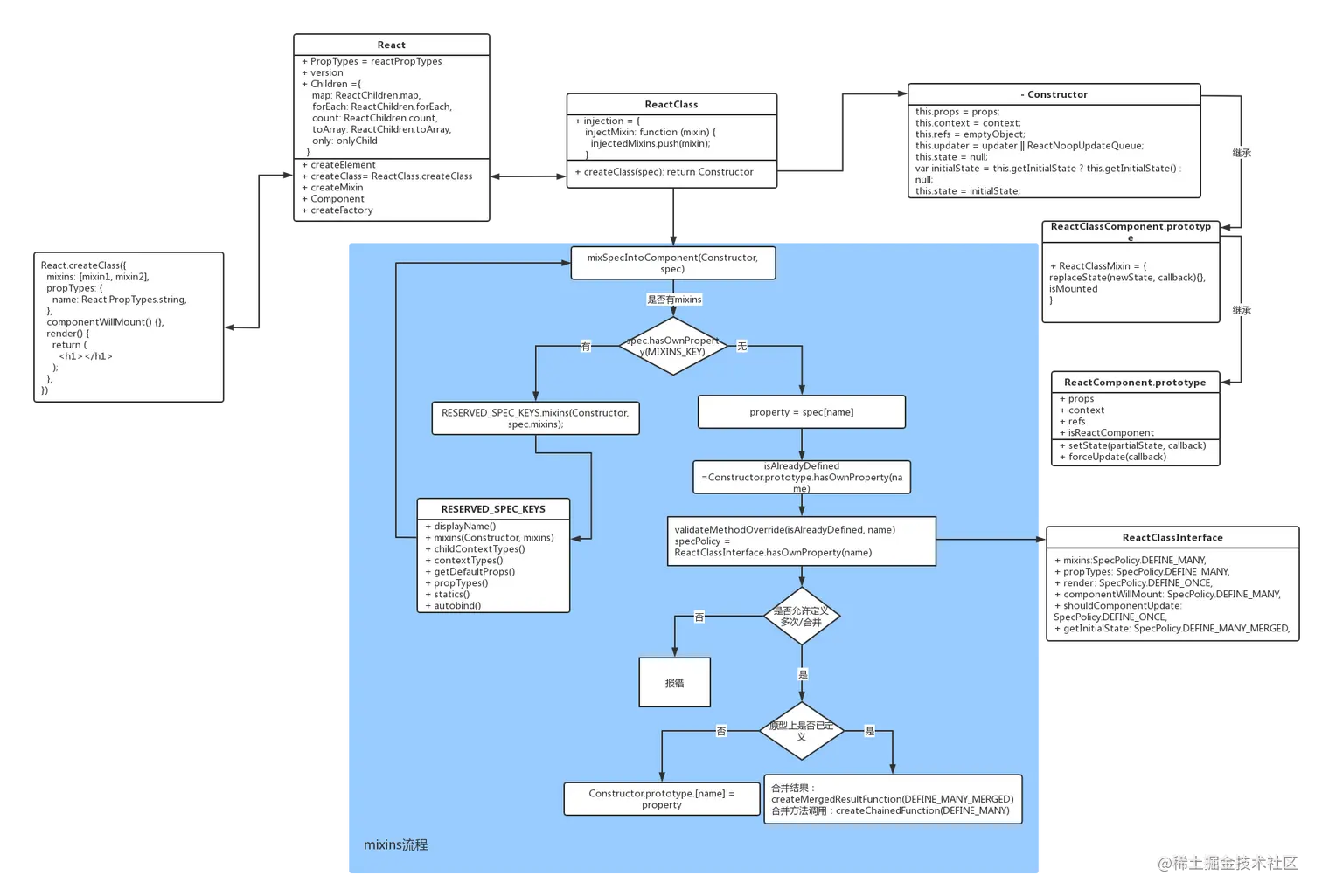 - 通过React.createClass(spec)接收到spec参数,判断spec对象中是否有mixins属性,