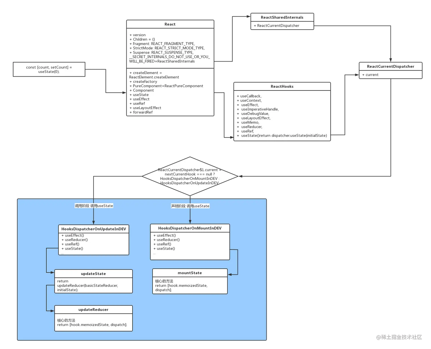 可以看到调用阶段:实际调用的HooksDispatcherOnUpdateInDEV对象的useState,然后useState又调用了updateState,最终调用了核心方法-updateReducer,接下来会重点分析这两个阶段核心的方法里mountState和updateReducer都做了啥。