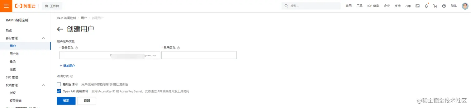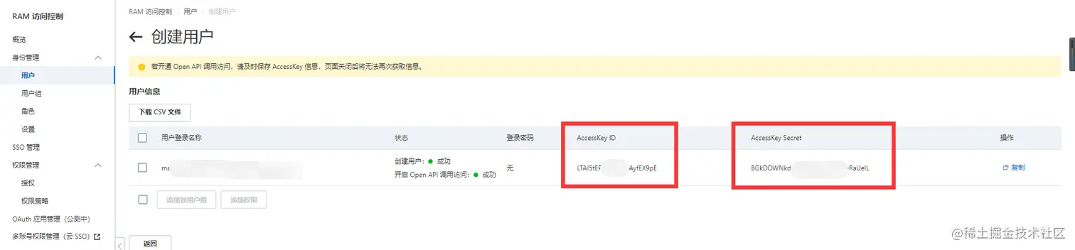 点击右上角头像-访问控制-用户-创建用户(勾选开启api访问)-进入AccessKey页面(将两个key存好,关闭后就没了),