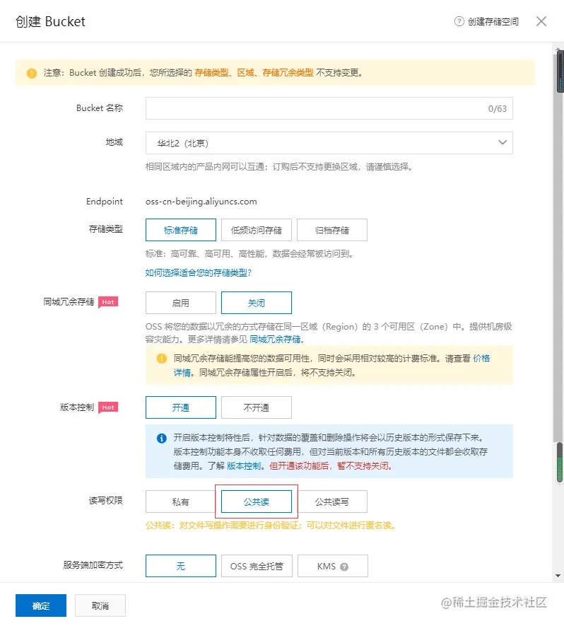 工作台-对象存储OSS-Bucket列表-创建Bucket,勾选公共读