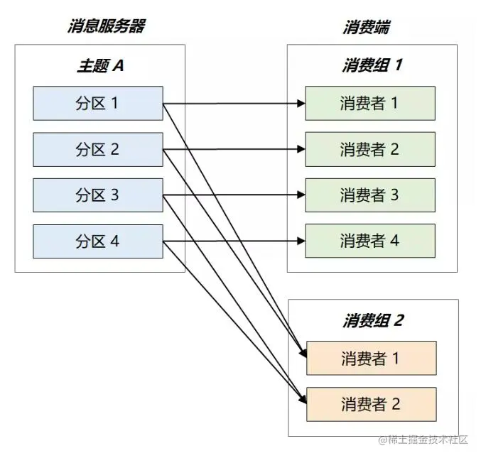 最终的消费关系如下图所示:假设主题 A 共有 4 个分区,消费组 2 只有两个消费者,最终这两个消费组将平分整个负载,各自消费两个分区的消息。