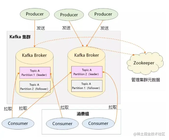 4、Zookeeper:负责集群的元数据管理等功能,比如集群中有哪些 broker 节点以及 Topic,每个 Topic 又有哪些 Partition 等。