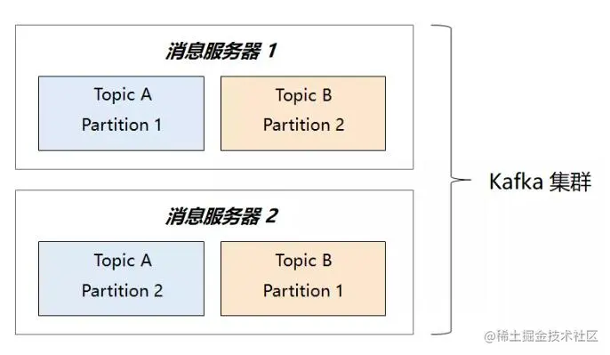 假设现在有两个 Topic,每个 Topic 都设置了两个 Partition,如果 Kafka 集群是两台机器,部署架构将会是下面这样: