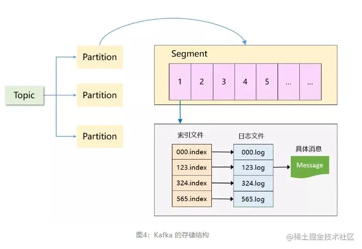 2、每个 Partition 又被分成了多个 Segment,Segment 从物理上可以理解成一个「数据文件 + 索引文件」,这两者是一一对应的。