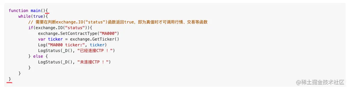 // 需要在判断exchange.IO("status")函数返回true,即为真值时才可调用行情、交易等函数