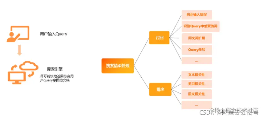 在搜索请求的处理过程中可以在工程实现上分为两个阶段,召回和排序。在召回阶段需要尽可能的把用户想要的文档在引擎中找到,在排序阶段需要将最满足需求的文档排在最前面去返回给用户。