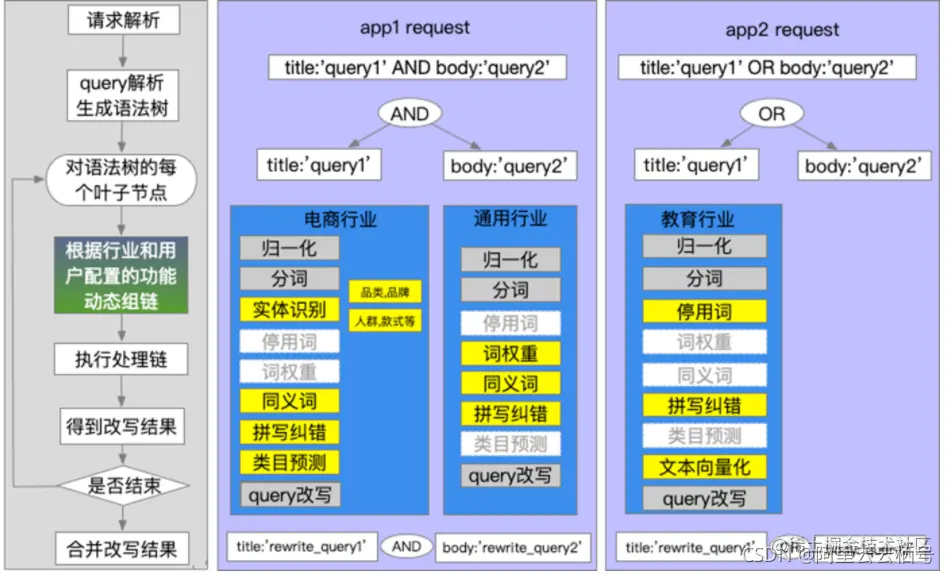 根据客户不同的业务场景去配置他的查询分析的能力,开放搜索提供这些能力功能的全集,用户可以根据实际需求选择其中一部分能力在实际生产环境中使用。 其次支持用户使用多种不同类型的查询分析,或者说是不同的查询分析的配置。