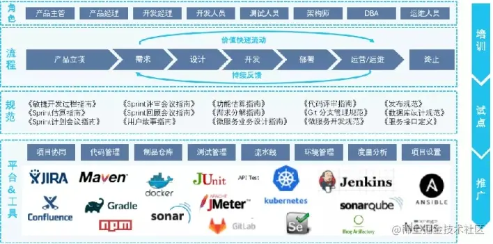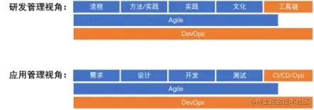 从研发管理的视角来说,Agile 已经涵盖了流程、方法、实践、文化,甚至一部分工具。Scrum 框架其实就是一些轻量级的流程方法的集合。而 XP 则更多的强调了很多好的工程实践。敏捷宣言本身就是敏捷文化的体现,甚至自带敏捷先驱们的浪漫主义情怀。而持续集成这一工程实践不可能脱离工具而存在。但 Agile 的各家言论并没有真正把“尽快交付业务价值”的最后一公里走完,所以完整的工具链,以及生产环境管理要到 DevOps 中去寻找答案。