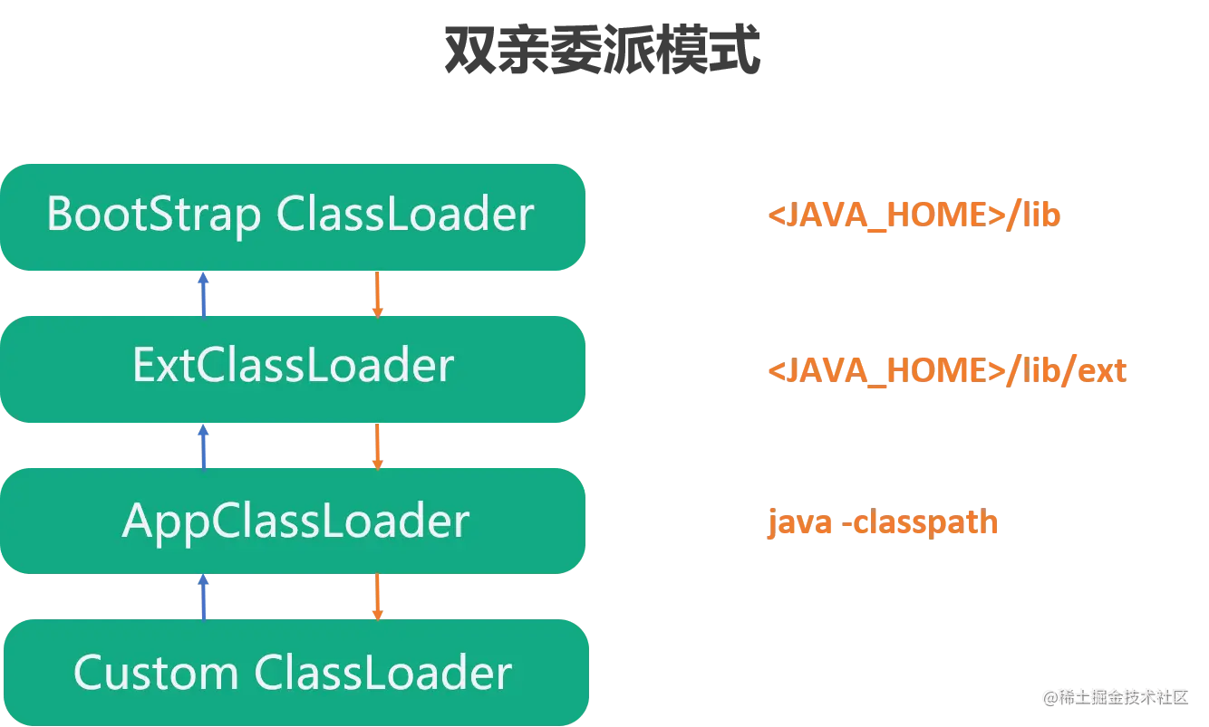 Java 的类加载使用双亲委派模式,即一个类加载器在加载类时,先把这个请求委托给自己的父类加载器去执行,如果父类加载器还存在父类加载器,就继续向上委托,直到顶层的启动类加载器,如上图中蓝色向上的箭头。如果父类加载器能够完成类加载,就成功返回,如果父类加载器无法完成加载,那么子加载器才会尝试自己去加载。如图中的桔黄色向下的箭头。