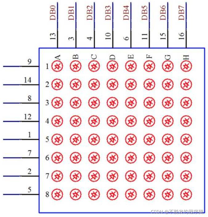 LED点阵模块和LED数码管一样,本质上是由多个发光二极管封装在一起组成,最直接的控制方式也是和LED数码管如出一辙,可以使用单片机I/O口控制每一个LED点阵灯。