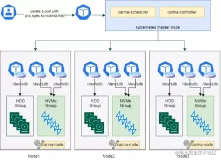 Carina-node 是运行在每个节点上的 agent 服务,利用 lvm 技术管理本地磁盘,按照类别将本地磁盘划分到不同的 VG 卷组,并从中划分 LV 提供给 POD 使用;