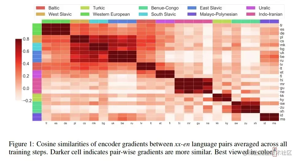 a.任务是翻译任务,不同的翻译语料共享一个大模型。如上图热力图,每一个格子的得分含义是:Baltic翻译成en的任务对应的gradient,与 Turkic翻译成en任务对应的gradient 之间的cosine similarity