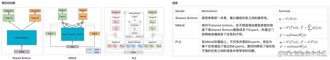 如下图,是Share Bottom、MMoE、PLE的网络结构和简单说明,细节不展开。