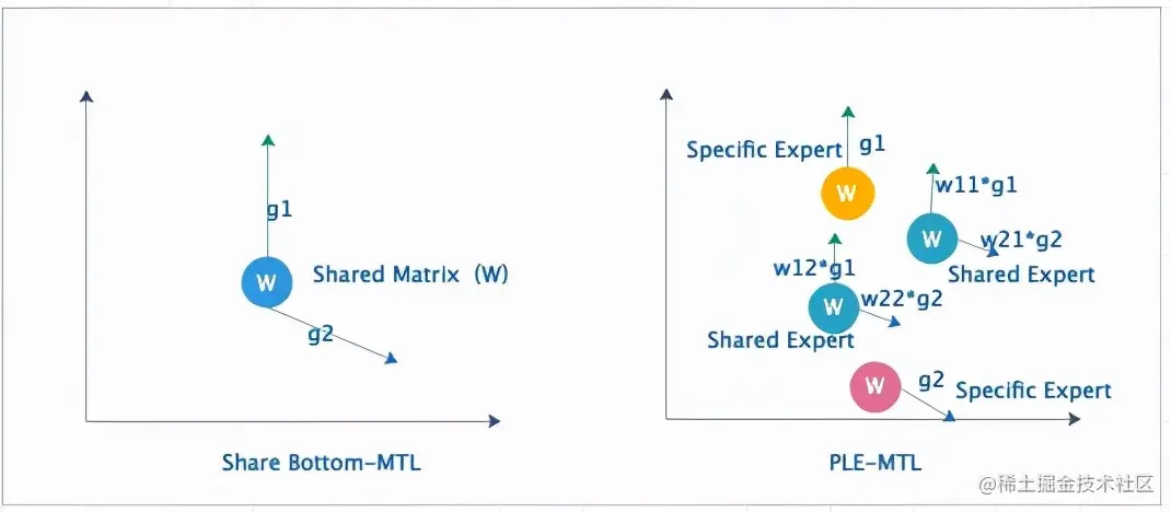 MMoE做了一个聪明的事情,“化整为零”。把一个共享参数矩阵化成多个结合gate的共享Expert,这样不同的loss在存在相互冲突的时候,在不同的expert上,不同loss可以有相对强弱的表达,那么出现相互抵消的情况就可能减少,呈现出部分experts受某task影响较大,部分experts受其他task主导,这种“各有所得”的状态。但是MMoE并不保证“各有所得”,PLE增加了spcific experts,保障“各有所得”,能够在“共享参数”的撕扯争夺上,有了最基础的保障。